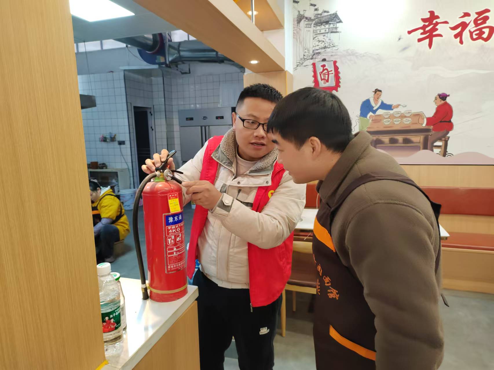 社区工作人员深入辖区的商铺、超市、酒店等重点区域和场所,检查了各单位场所是否配备了灭火器、应急照明灯、烟雾报警器等消防设施,并针对灭火器的使用,提醒商户牢记“提、拔、握、压”的使用口诀和冬季用电用火安全。