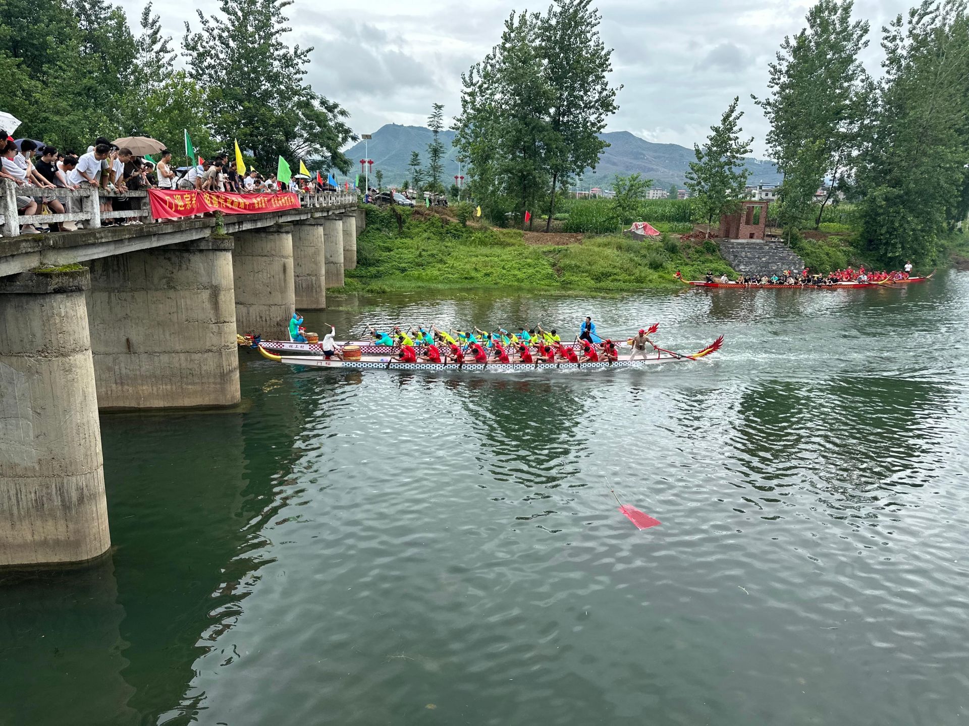 当日上午,黑门楼1、2、9、10组门楼龙舟队在紧张激烈地进行着。朝阳河畈刘氏5个村的龙舟队伍齐聚一堂,展开了一场速度与力量的角逐。随着一声令下,一条条龙舟如离弦之箭,在水面上飞驰。选手们齐心协力,喊着整齐的号子,奋力划桨,龙舟在水面上劈波斩浪,溅起朵朵水花。岸边,观众们的加油声、呐喊声此起彼伏,整个赛场气氛热烈,充满了激情与活力。