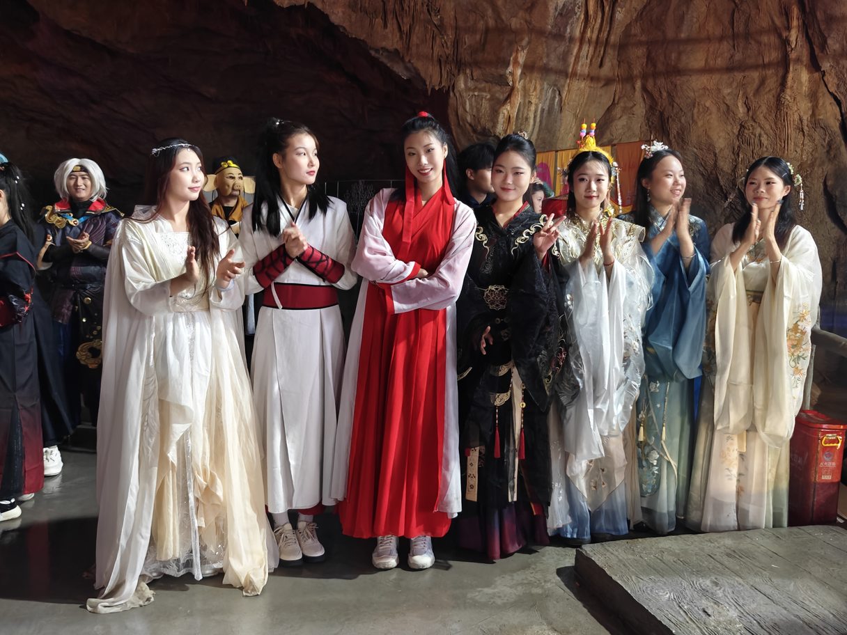 景区精心设置“投壶游戏”“乾坤一掷”等传统仙侠互动项目,20余名专业NPC(角色扮演者)穿梭其中,游客可与“酒剑仙”论剑,或助“小龙女”寻“杨过”,沉浸