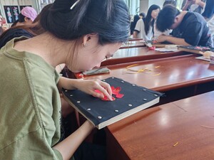 本网讯(通讯员 陈思宇)为加强对非遗文化的传承,加强对非遗文化的了解,2025年8月3日,湖北第二师范学院经济与管理学院“拾遗”志愿服务队黄石分队赴阳新文化馆展开参观学习与实践。活动由洪老师为队员们详细讲解民俗馆,队员们深刻了解到阳新的民俗服饰、民俗工艺品以及采茶戏和孔老师为队员们介绍最具特色的非遗文化--阳新布贴,并指导队员们制作布贴。通过此次活动,队员们感受到阳新民俗文化与布贴文化的魅力。