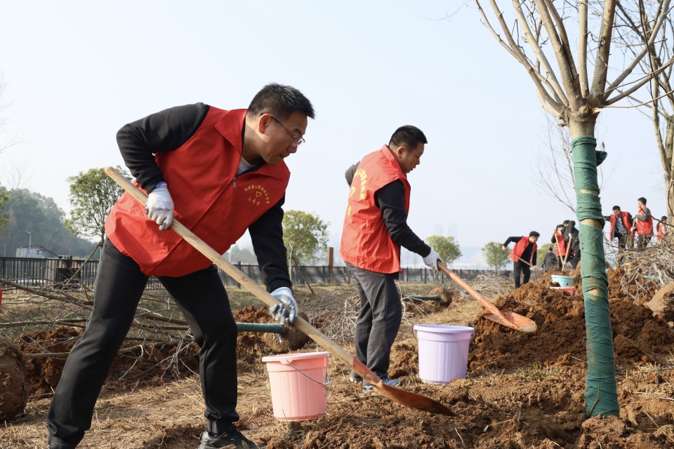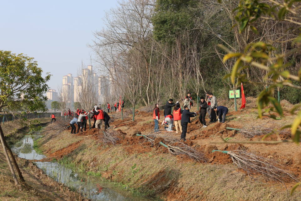初春的莲花湖国家湿地公园,阳光和煦,气温适宜。上午8时45分许,参加植树的人员陆续抵达“落虹堤”边的植树点,迅速投入到劳动中。大家一起挥锹铲土、扶苗填坑、踏土夯苗、提桶浇水,每一道工序都认真细致。经过辛勤劳作,一株株新栽种的紫玉兰和池杉树苗错落有致地挺立在湖堤边,展现出勃勃生机。