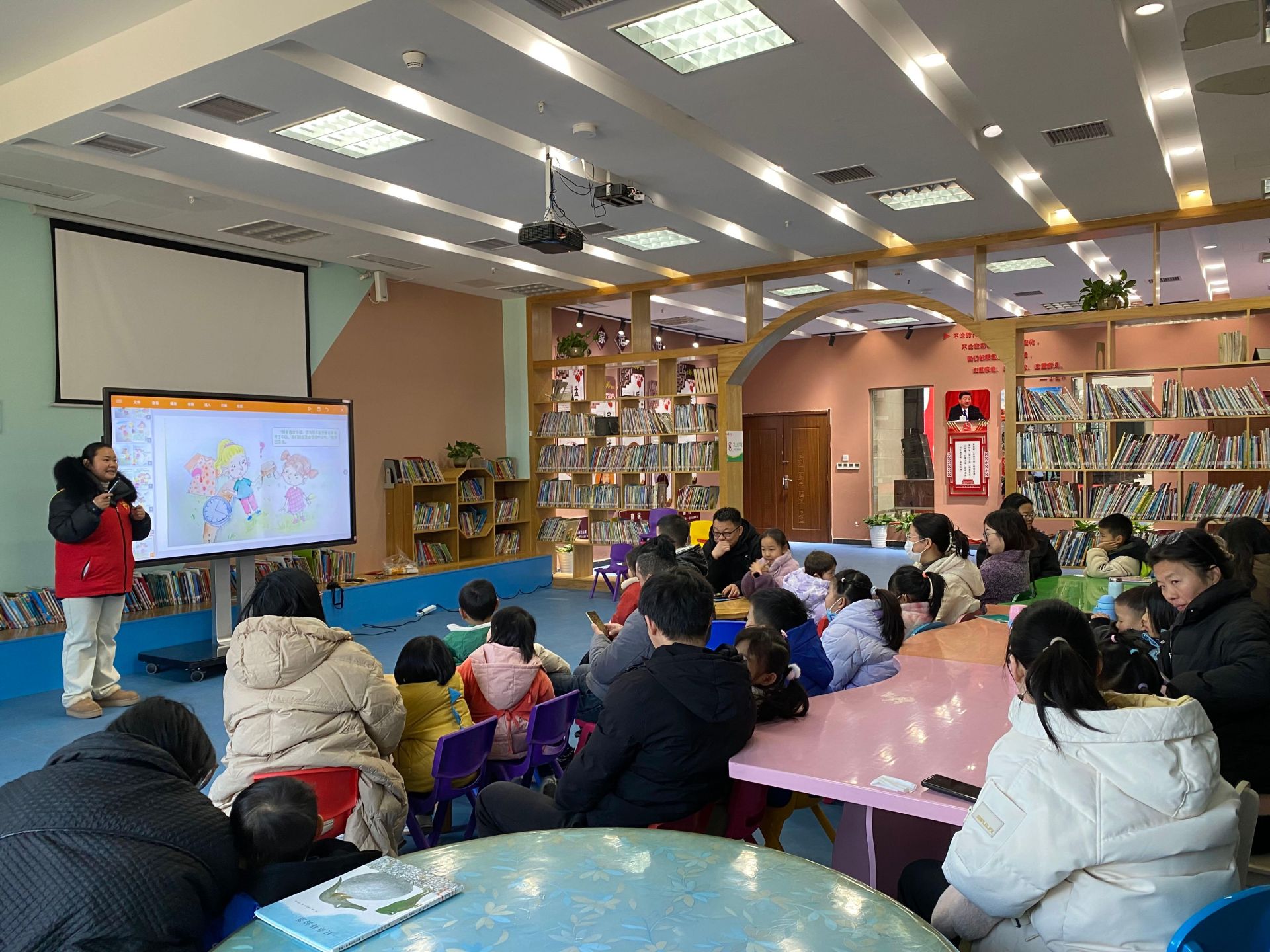 为迎接新年的到来,29日,县图书馆精心策划了“弘扬爱国主义,传承红色基因”阅读体验活动。 在“红伢仔”绘本故事活动现场,图书管理员黄慧琳为孩子们带来了精彩的绘本故事《我爱你中国》的讲解。通过黄老