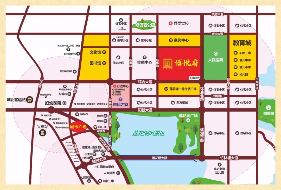 阳新城东14万方——新中式园林名校华宅博悦府位于城东规划核心区域——综合大道与新华路交汇处,东依教育城、人民医院、园博园;南望莲花湖湿地公园,莲花湖一号生活广场