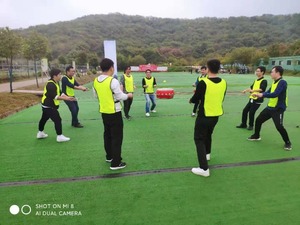 接着玩运转乾坤。分好组之后,开始之后,组员都握着大球底部,往前跑,来回两趟下来用时醉短的获胜。