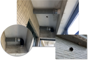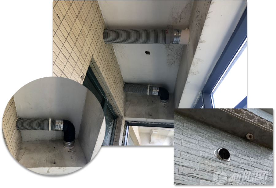 新风系统的室外出风口和进风口的距离需要在1.5米以上,防止将排出的污浊空气再次吸入室内,因此,该处外风口位置特意绕开。新风系统的室外出风口和进风口的距离需要在1.5米以上,防止将排出的污浊空气再次吸入室内,因此,该处外风口位置特意绕开。