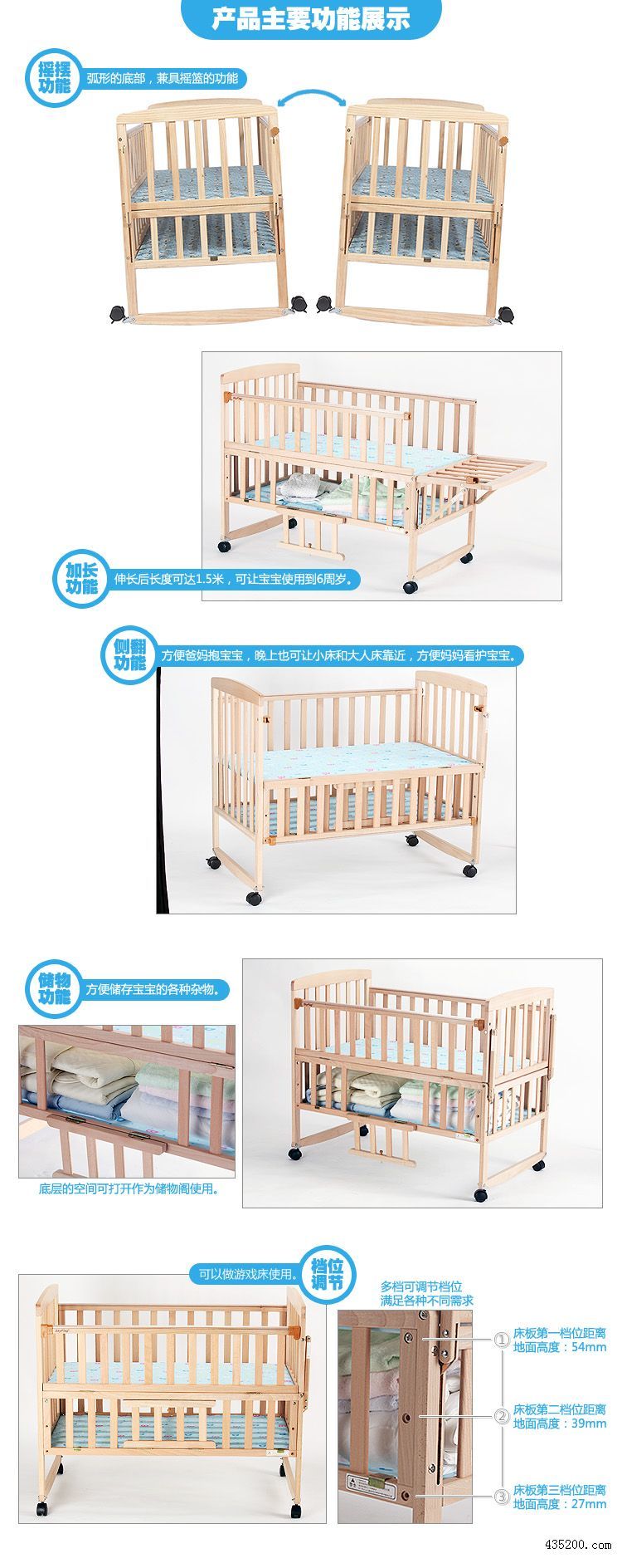可加长的床头,可以伴随宝宝成长;
