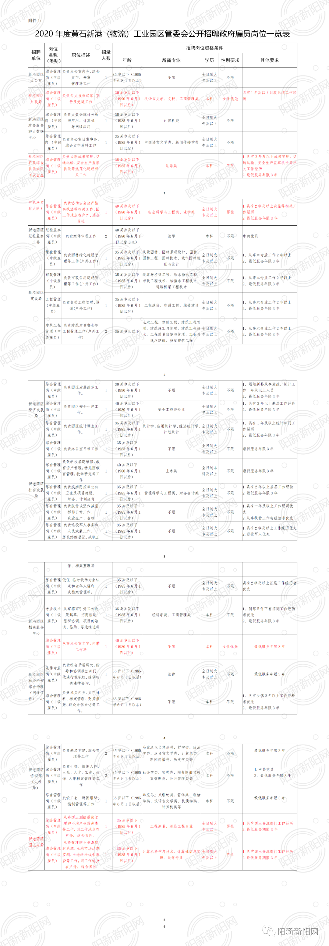 详见《2020年度黄石新港(物流)工业园区管委会公开招聘政府雇员岗位一览表》(附件1)。