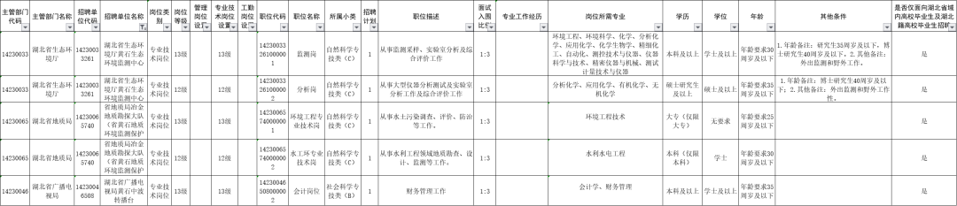 (二)《岗位表》中的岗位,一部分面向湖北省域内高校毕业生及湖北籍高校毕业生(包括应届高校毕业生和择业期内未落实工作单位的高校毕业生)招聘,另一部分面向所有符合岗位条件的人员(包括省内外应届、往届高校毕业生和其他各类社会人才)招聘。